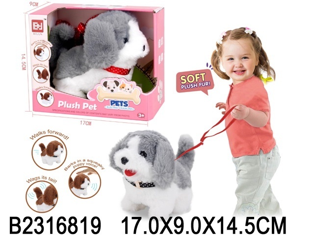 Щенок на батарейках, мягкий плюшевый мех, ходит, виляет хвостом, лает, батарейки в комплект не входят, цвет серо-белый, в коробке 17*9*14,5 см.