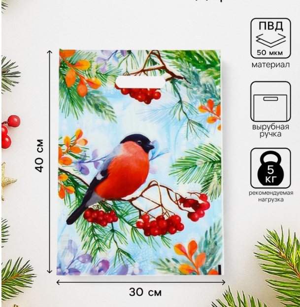 Пакет "Снегирь на ветке рябины", полиэтиленовый с вырубной ручкой, 30х40 см, 50 мкм