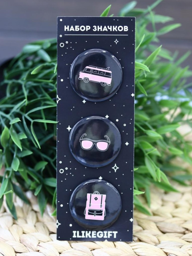 Стильный, яркий и запоминающийся набор значков с дизайнерскими принтами. Значки выполнены из металла с нанесением глянцевой ламинации. Крепление - булавка. В комплекте три значка. Индивидуальная упаковка с плотным хедером, еврослотом и картонной подложкой.