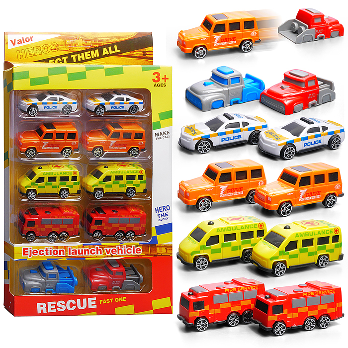 • В наборе: - 8 машинок. - 2 устройства для запуска. • Размеры машинки: 7х3х3 см. • Материал: пластик. • Соответствует требованиям безопасности и стандартам качества продукции. • Для детей от 3-х лет.