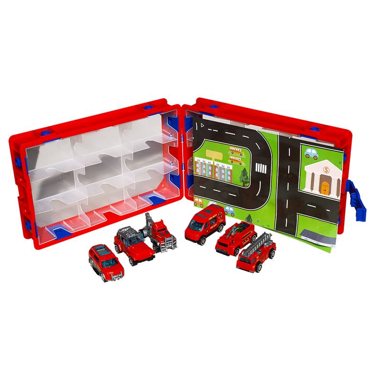 Набор включает практичный пластиковый чемоданчик для хранения машинок, что делает его удобным для игры дома и на улице. Игровой коврик с дорогами и разметкой добавляет увлекательности, позволяя создавать различные сюжетные линии и ситуации, связанные с работой пожарной службы.