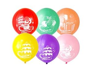 Шар из натурального латекса. Ассорти из 10-12 цветов (в случайном соотношении), одного типа - пастель - матовый оттенок цвета. Шары с двусторонним шелкографическим рисунком (5 дизайнов, одной темы в пакете) с большим полем печати