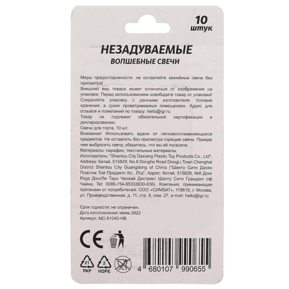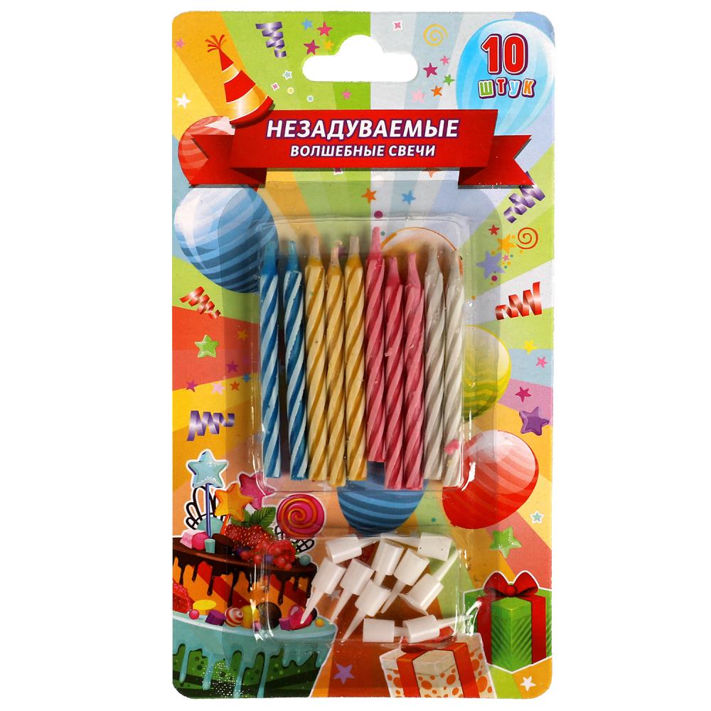 Волшебные свечи для торта «С днём рождения» подарят вам незабываемый праздник: - 10 свечей 4-х цветов - 10 подставок - незадуваемые Танцующие огоньки свечей сделают появление торта на празднике максимально эффектным и помогут создать атмосферу настоящего торжества. Именинник может загадать сразу несколько желаний, раз за разом задувая волшебные свечи под громкие аплодисменты родных и друзей. Размер: 6 х 10 х 1 см. Материал: парафин. Рекомендовано детям от 3-х лет.