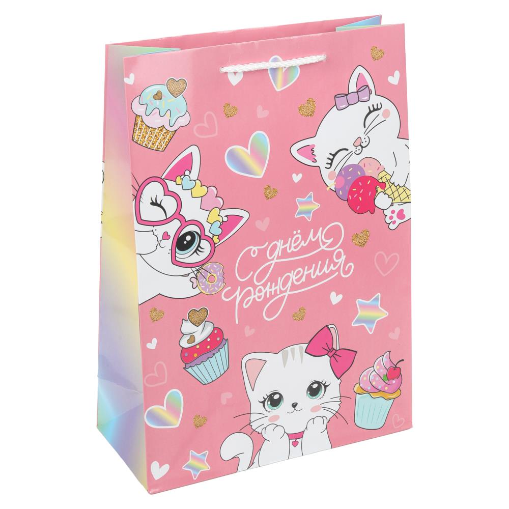 Праздничный подарочный пакет с милыми котиками станет ярким запоминающимся штрихом, изюминкой подарка, и принесёт виновнику торжества радость предвкушения. Ему будет интересно заглянуть в него, чтобы узнать, что же приготовили родные или друзья на день рождения.