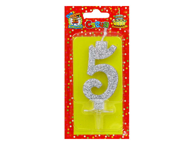 Свеча для торта Серебряный глиттер Цифра 5 С-1833