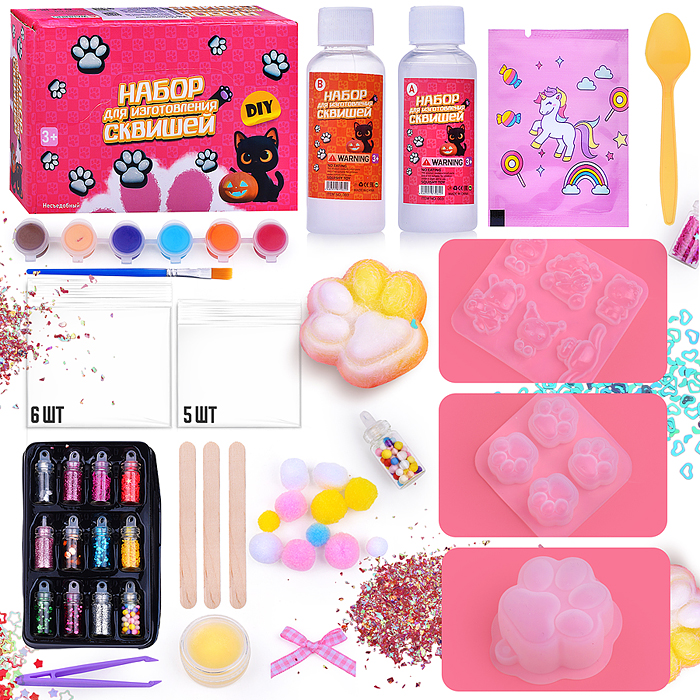 Создай свой сквиш! Набор для творчества и развлечений! Хотите удивить друзей оригинальным подарком или просто весело провести время? Наш набор для создания антистресс-игрушек - это идеальный выбор! В этом наборе есть все необходимое, чтобы создать собственную уникальную и забавную лапку или другой сквиш. Проявите свою фантазию, экспериментируйте с цветами и текстурами! Преимущества нашего набора: • Просто и увлекательно: Справится даже новичок! Подробная инструкция шаг за шагом проведет вас через весь процесс. • Развивает творческие навыки: Лепка способствует развитию мелкой моторики, воображения и креативности. • Уникальный результат: Создайте неповторимый сквиш, которая отражает вашу индивидуальность. • Отличный подарок: Оригинальный и запоминающийся подарок для друзей, близких и коллег. Предупреждение: • Содержит мелкие детали. Не рекомендуется для детей младше 6 лет.