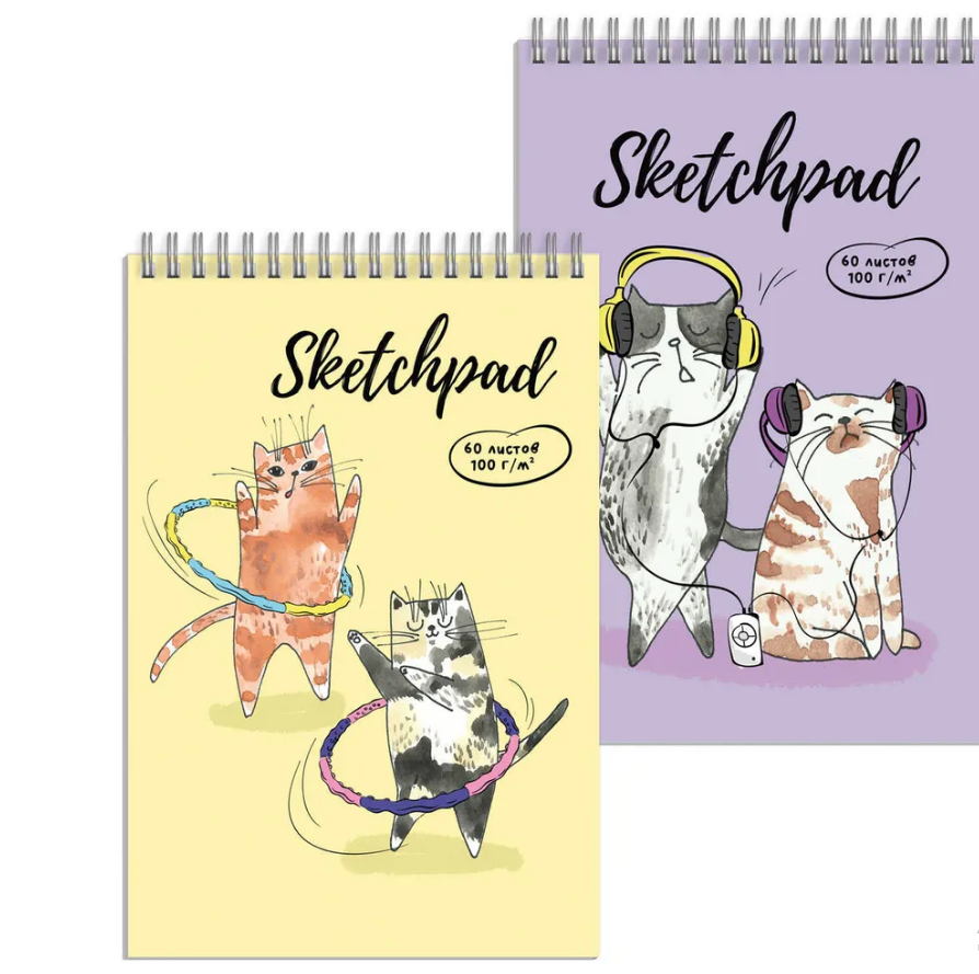 Скетчпад. ВЕСЕЛЫЕ КОТИКИ. Формат: А5. Размер 148х210 мм. Количество листов - 60 л. Тип обложки: твёрдый переплёт на гребне. Цвет внутреннего блока - белый офсет. Плотность бумаги 100 г/м². Обложка: полноцветная печать. Ламинация обложки - матовая ламинация. Особенности: перевёртыш.