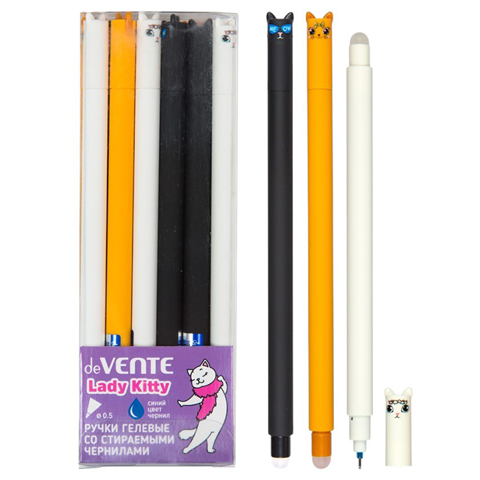 Ручка гелевая стираемая "deVENTE. Lady Kitty" d=0,5 мм, цвета корпуса ассорти 3 цвета, с декоративным элементом и запечаткой на колпачке, с ластиком, сменный стержень, индивидуальная маркировка, синяя