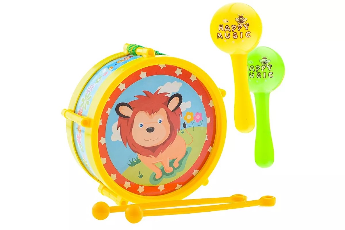 В наборе: - барабан (13.5х13.5х6.5 см.) - барабанные палочки (15.5 см.) - 2 маракаса (12 см.) • Материал: пластик. • Соответствует требованиям безопасности продукции. • Для детей от 3-х лет.