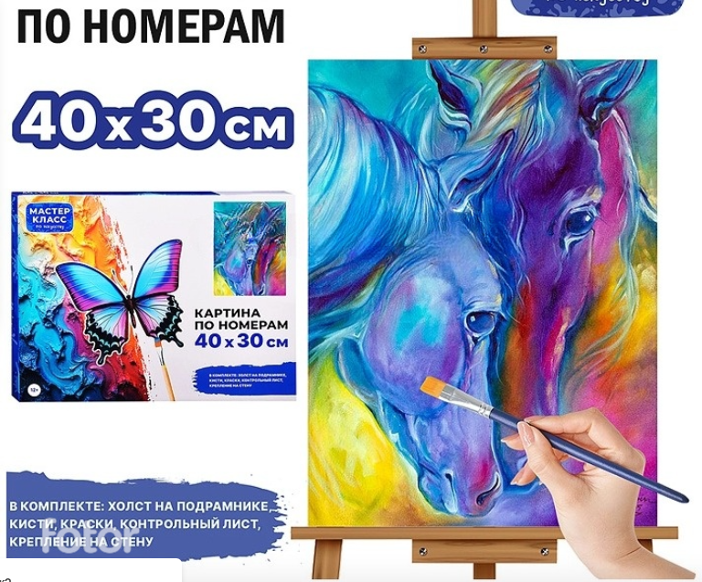 В наборе: - холст на деревянном подрамнике (40 х 30 см.) - акриловые краски. - кисти. - фурнитура для крепления картины на стене. - инструкция со схемой рисунка. Соответствует требованиям безопасности продукции. Для детей от 12 лет.
