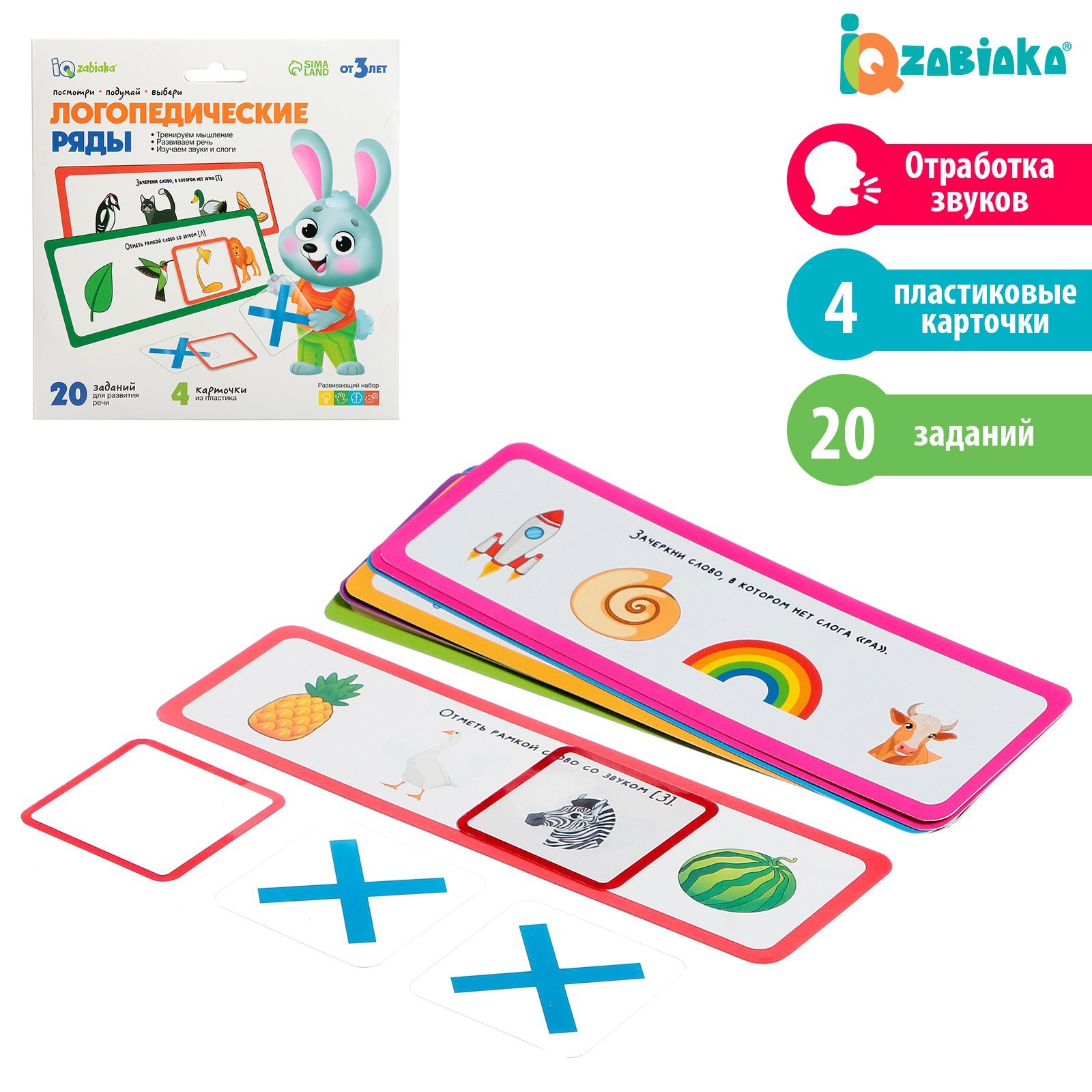С развивающим набором «Логопедические ряды» малыш в лёгкой игровой форме потренирует внимательность, произношение сложных звуков и умение выделять предметы по разным признакам. Внутри вы найдёте 4 пластиковые карточки и 20 заданий. Как пользоваться набором Выберите карточку с заданием. Прочитайте текст задания и обсудите его с малышом. Попросите ребёнка выполнить задание, отметив ответ карточкой с крестиком или рамкой. Например, зачеркните слова, в которых нет слога «бе», отметьте рамкой слово с самым большим количеством слогов. Ещё больше заданий вы найдёте на карточках. Фантазируйте и придумывайте свои увлекательные задания для ребёнка. Польза занятий с развивающим набором «Логопедические ряды» С такой игрой ребёнок расширит кругозор, потренирует логическое мышление и память, а также закрепит правильное произношение звуков. Рекомендовано детям от 3 лет.