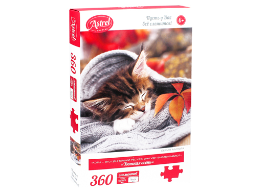 Милые котята и щенята, изображенные на пазлах из 360 элементов линейки Astrel, вызывают умиление и настраивают на позитивный лад! Каждый пазл является уникальным украшением интерьера, соберите всю коллекцию картин, которые сделают уютным и добрым каждый дом! Размер собранной картинки: 475х475 мм. Размер детали: 40х28 мм. Материал: картон, бумага. Для детей от 6-ти лет. Не рекомендуется детям до 3-х лет. Содержит мелкие детали. Сделано в России.