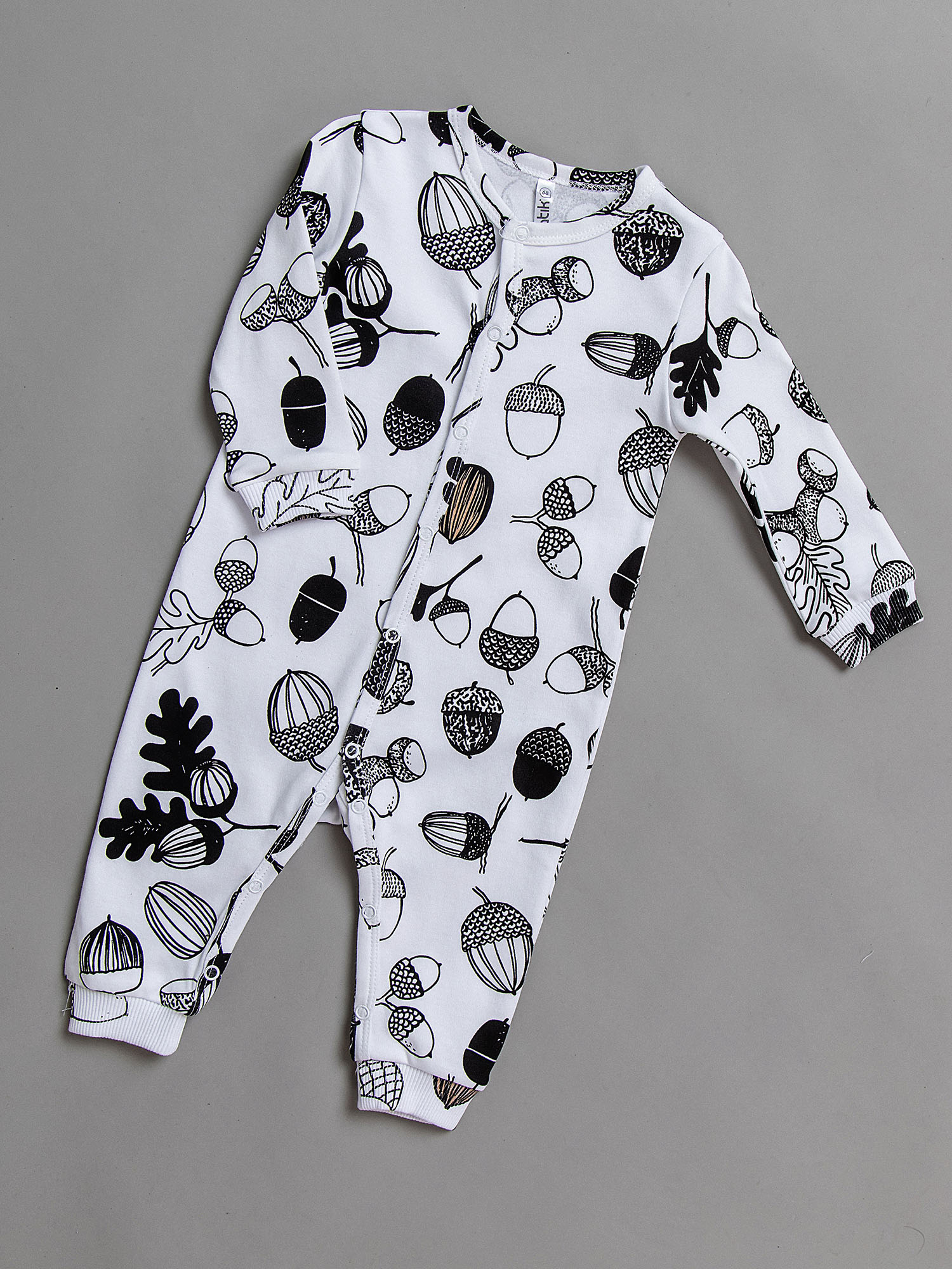 Комбинезон нательный для новорожденных трикотажный с длинным рукавом на кнопках. Фирменный слип с открытыми носочками для малышей с самых первых дней жизни из премиального 100% хлопка интерлок. Принт в виде орешков. Характеристики: Ткань: Интерлок, 100% хлопок Производитель: batik