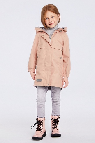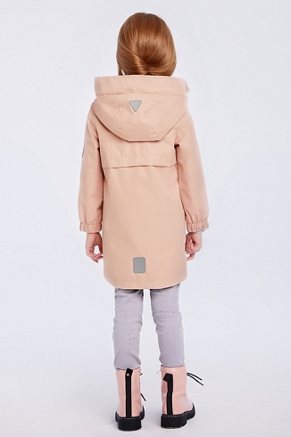 Куртка-ветровка для девочки из мембранной ткани. Куртка полуприлегающего силуэта, на подкладке из трикотажа и подкладочной ткани. Светоотражающие шевроны с фирменным логотипом «FOX-CUB»: на правой полочке куртки, на спинке куртки, на средней части капюшона. Шеврон СВ Junior на левом рукаве. В правом боковом шве куртки расположен флажок «FOX-CUB». Застежка центральная на тесьму-молнию снизу до верха, закрытая планкой, застегивается при помощи кнопок и липы. Со стороны подкладки имеется ветрозащитная планка. Верхний край молнии защищен ветрозащитной планкой. Карманы прорезные, застегивающиеся на кнопку. Низ рукава с резинкой. Капюшон втачной «Алясочный» с отворотом и с регулировкой объема с помощью шнура и фиксаторов. Низ куртки фигурный. Подкладка куртки: верхняя часть спинки и полочки из трикотажа, нижняя часть полочки, спинки и рукава из подкладочной ткани.
