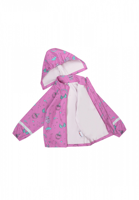Куртка-дождевик на молнии для девочки из 100% полиэстера на трикотажной основе с полиуретановым покрытием (без ПВХ). Ткань полностью водонепроницаема, а швы по всей куртке запаяны, благодаря чему куртка способна защитить даже от ливня. Забавный мелкий принт органично смотрится на однотонном розовом фоне и добавляет образу романтичности и нежности. Молния имеет ветрозащитную планку по всей длине с защитой подбородка. На рукавах есть световозвращающие элементы. Край съемного капюшона, манжеты рукавов и низ дождевика на резинке для лучшей защиты от ветра. Такой дождевик можно надевать поверх легкой куртки или футболки и толстовки во время дождя.