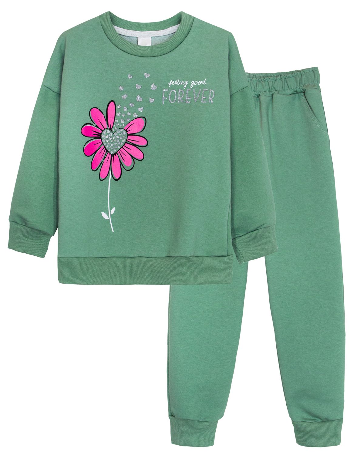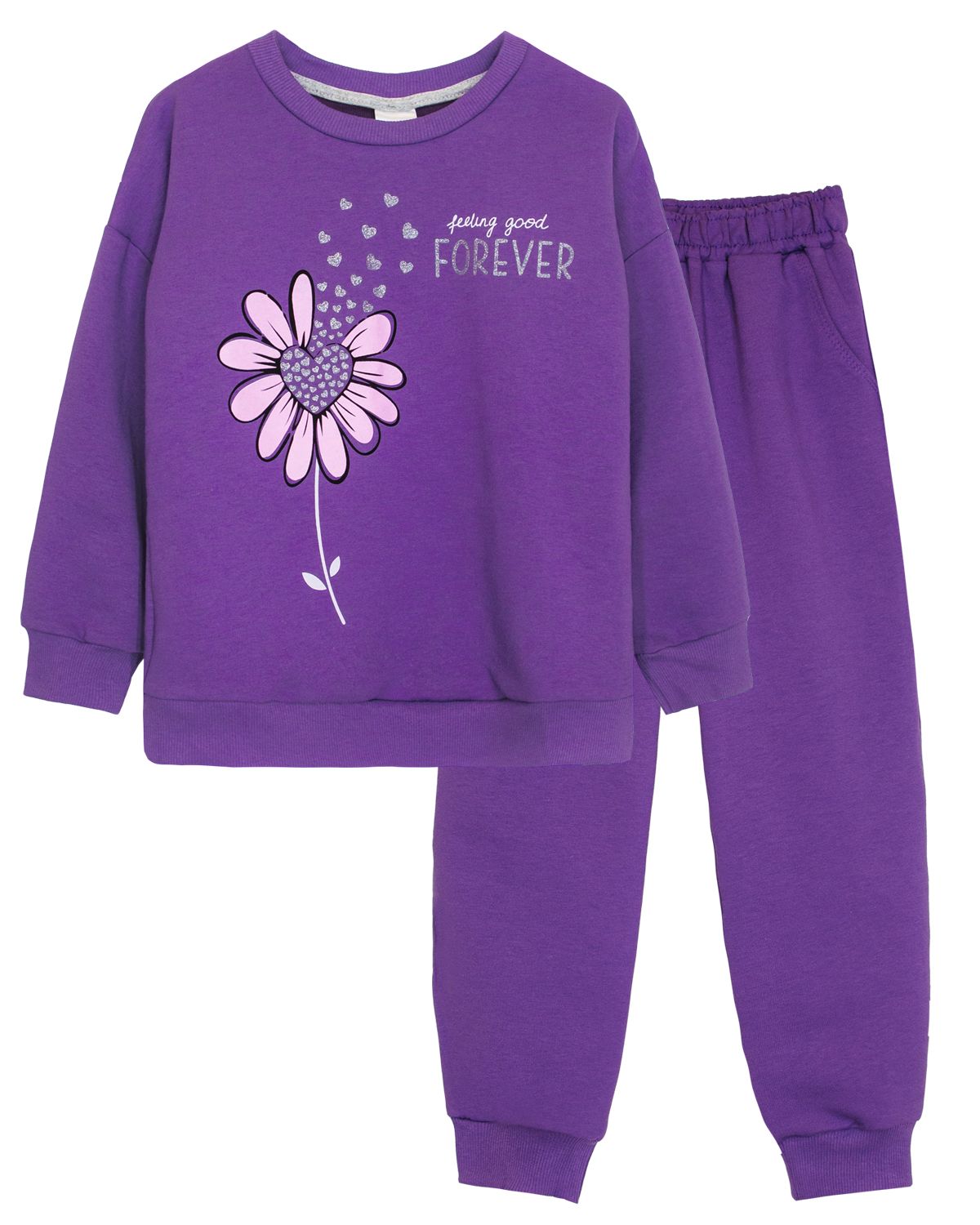 Костюм для девочки состоящий из джемпера и брюк. Толстовка прямого силуэта с спущенным длинным рукавом. Горловина круглая, обработана воротником из кашкорсе. На полочке принт шелкография с серебряным глиттером. Брюки прямого силуэта.