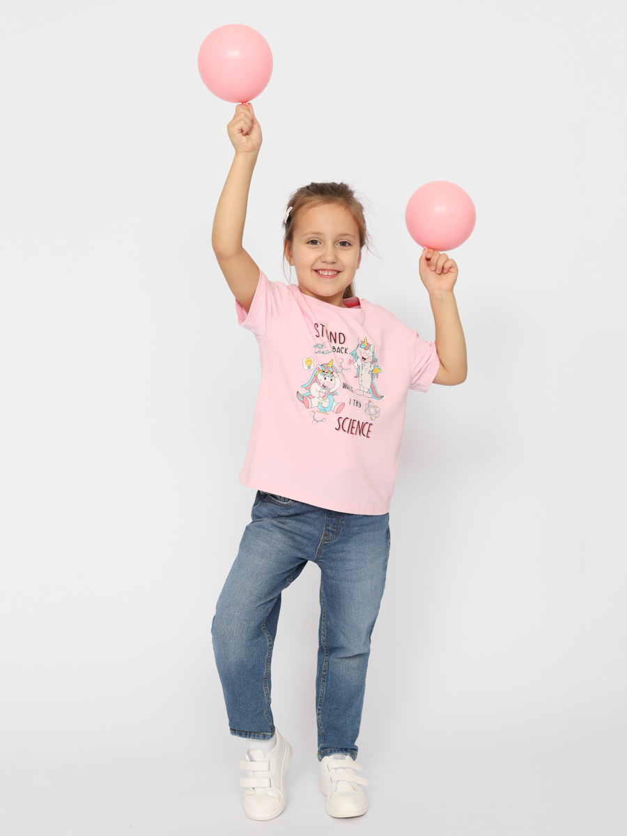 Набивная футболка oversize для девочки. Горловина обработана воротником из полотна с эластаном. В нижней части футболка декорирована жаккардовой этикеткой.