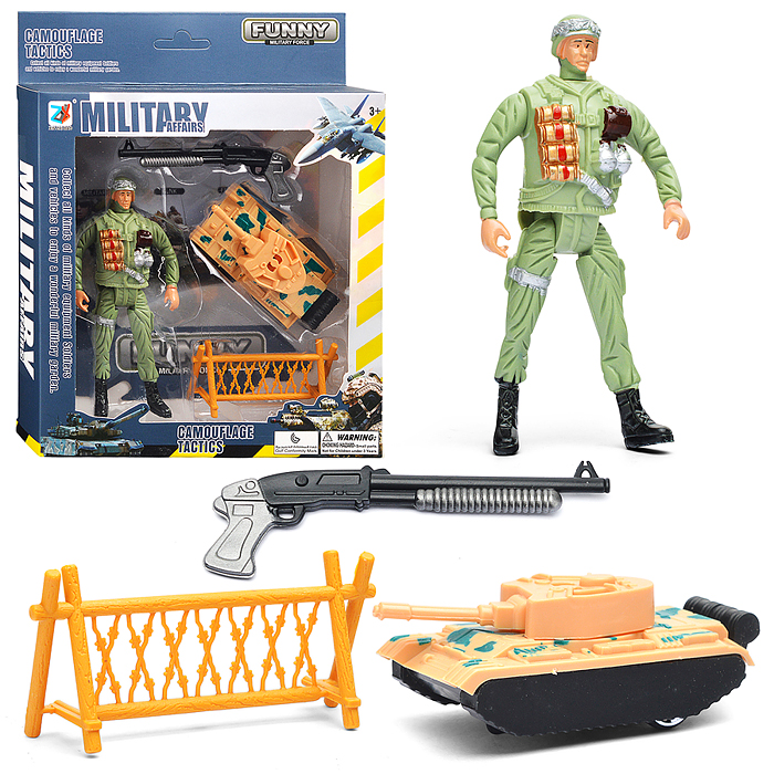• В наборе: - фигурка солдата (6х3х12 см.) - танк с инерционным механизмом (9х3.5х3 см.) - аксессуары. • У солдата подвижные руки и ноги, поворачивается голова. • Материал: пластик. • Соответствует требованиям безопасности продукции. • Для детей от 3 лет.