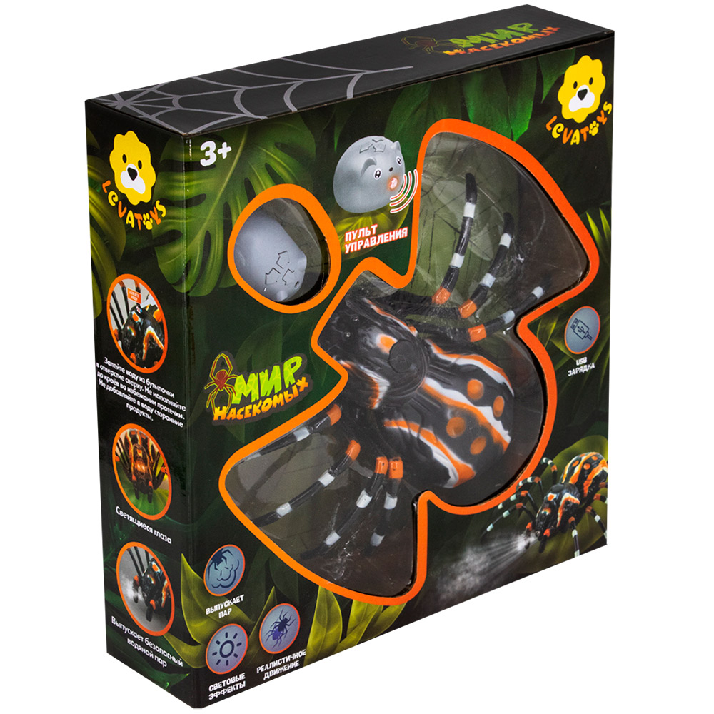 Размер упаковки: 27 х 7,5 х 28,5 см Размер изделия: 16 х 20 х 6,5 см Игрушка на радиоуправлении Комплектация: паук - 1 шт, пульт управления - 1 шт, USB кабель - 1 шт, бутылочка для воды - 1 шт Возраст ребенка: для детей от 3 лет Паук на радиоуправлении - это реалистичное погружение в игровой мир. Особенности: - реалистичные движения - функция демонстрации - светящиеся глаза - игушка выпускает безопасный пар - вода заливается при помощи специальной бутылочки (входит в комплект) - 3-х частотный пульт управления, которым возможно одновременно играть тремя игрушками - для пульта необходимо 2 батареи LR44, и 1 LR1130 (допускается использование 3-х батарей LR44) - в игрушке встроенный аккумулятор, который можно заряжать - зарядка от USB кабеля (в комплекте) - световой индикатор зарядки - игрушка может работать от 2 батареек ААА 1.5V (не входят в комплект)