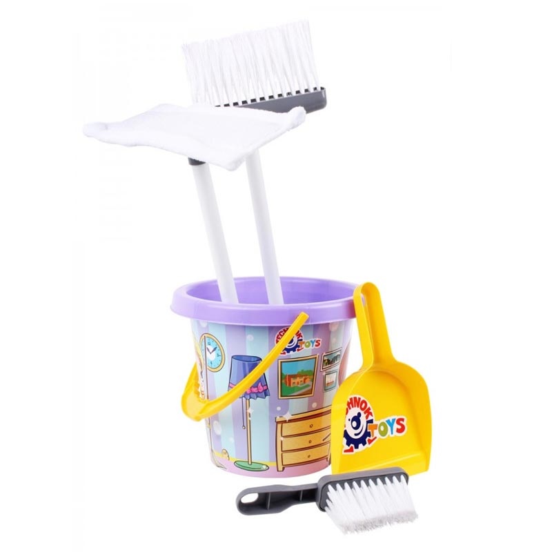 В наборе большое яркое ведерко, швабра, метла, щеточка и совок. Рисунок на ведре выполнен с помощью технологии IML, а следовательно его невозможно отклеить и со временем он не потускнеет, а тема - веселая уборка. Розовая и фиолетовая цветовые гаммы дают возможность выбрать набор как для девочки, так и для мальчика. Размеры игрушечных элементов специально рассчитаны для удобного использования, а после уборки можно хранить веничек и швабру в ведерке.