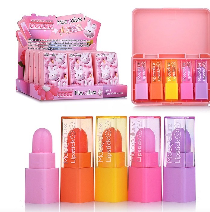 В наборе: - бальзам для губ 5 цветов. Соответствует требованиям безопасности продукции. Для детей от 3 лет.