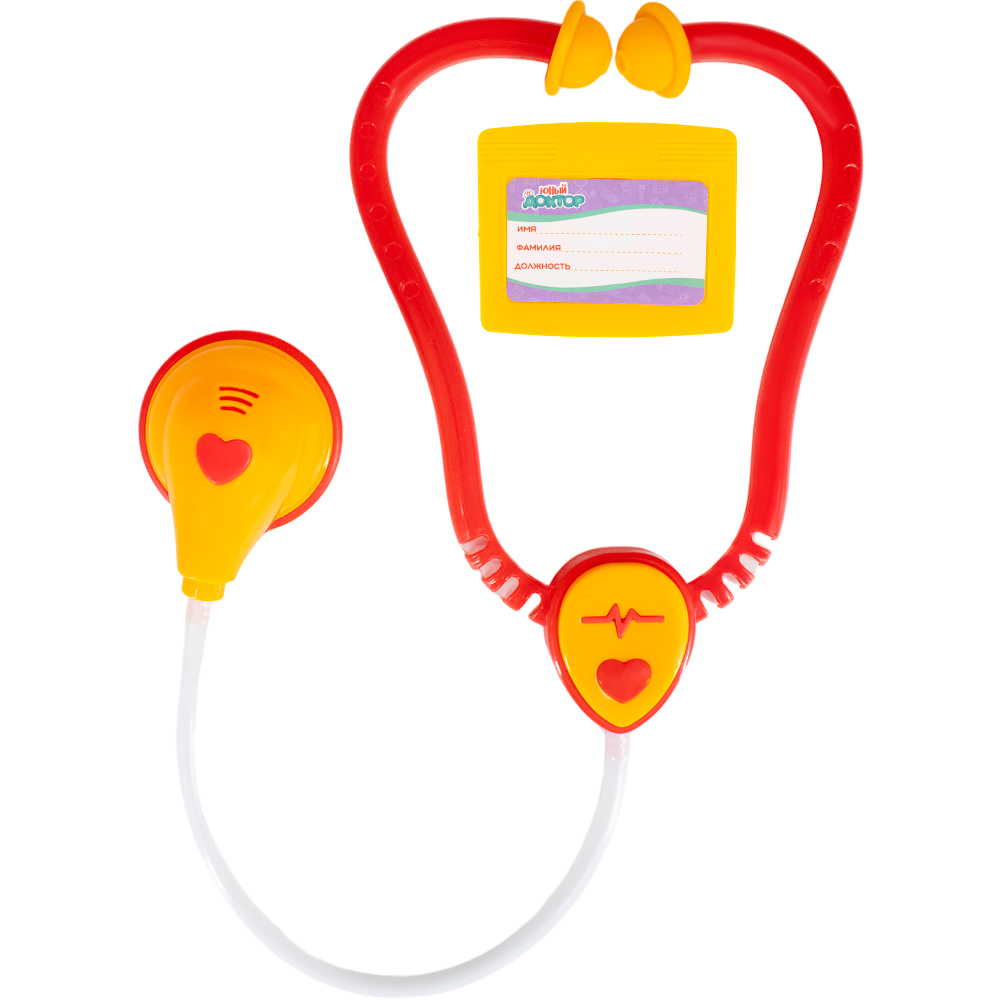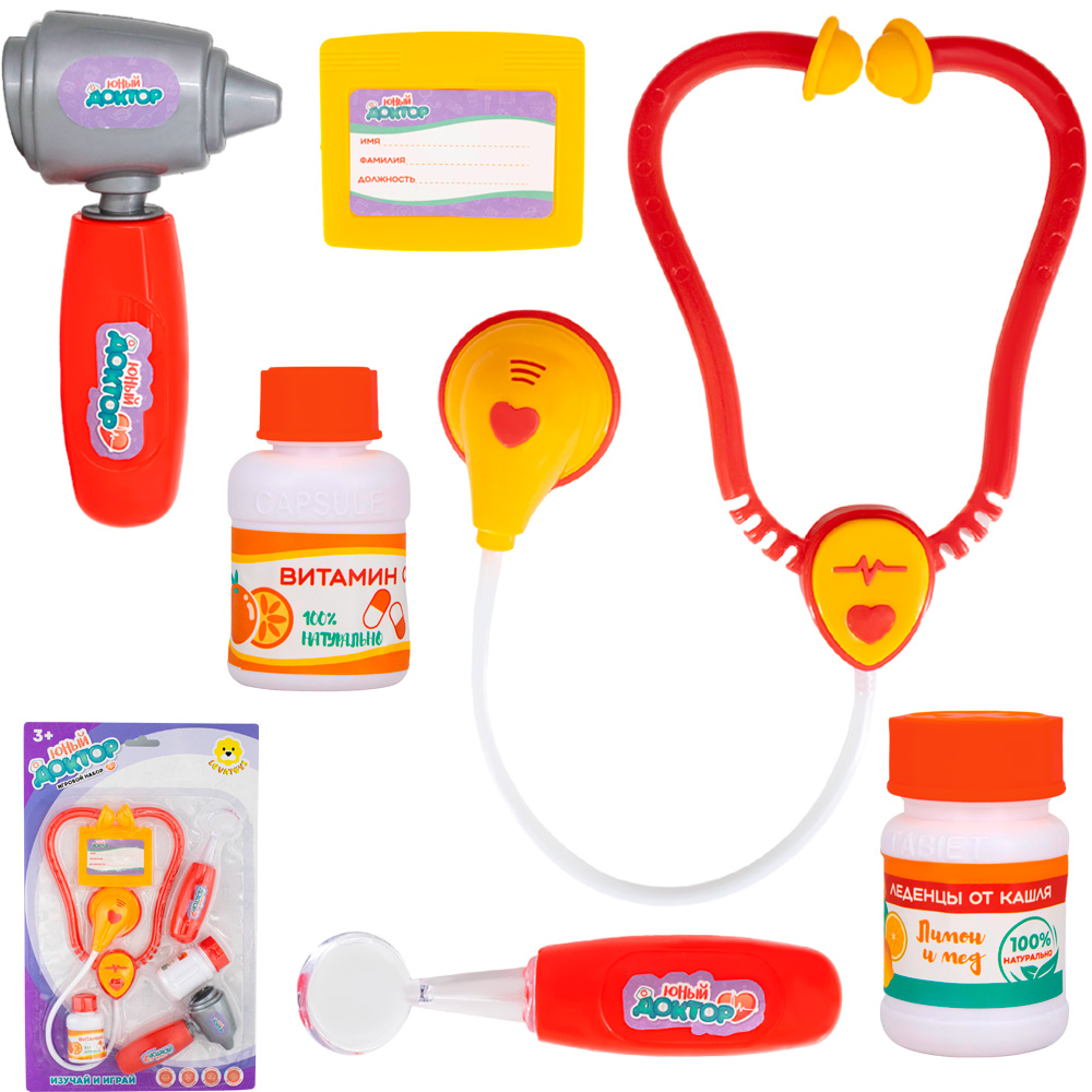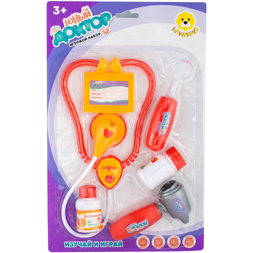 Размер упаковки: 21,5 х 3 х 34 см Вид упаковки: блистер Функционал: игровой набор для сюжетно-ролевых игр Страна производитель: КНР Материал: пластик Комплектация: стетоскоп (45 х 13 см) – 1 шт., баночка с надписью "витамины" (3,5 х 6 см) – 1 шт., баночка с надписью "леденцы от кашля" – (3,5 х 6 см) – 1 шт., бейдж (6,5 х 5,5 см) – 1 шт., отоскоп (11,5 х 6 см) – 1 шт., гортанное зеркало (12,5 х 3 см) – 1 шт. Возраст ребенка: 3+ Игровой набор «Юный доктор» от ТМ «Levatoys» поможет детям примерить на себя образ врача и придумать множество увлекательных ролевых игр. В наборе много интересных и достаточно реалистичных медицинских инструментов. Дети с любопытством организуют занимательные игровые сюжеты, связанные с медицинской тематикой. Например, можно открыть свою больницу и начать лечить свои игрушки. Изготовлен набор из высококачественного, прочного и безопасного пластика. Особенности: - привлекательный внешний вид; - яркая расцветка; - русифицированные красочные наклейки; - бейджик можно прикрепить себе на гр
