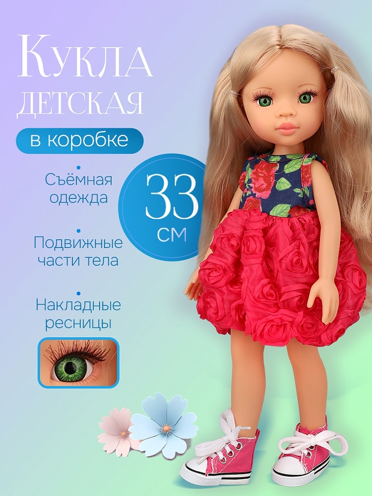 Сюжетно-ролевые игры — важная часть развития ребёнка. Играя в куклы, девочки не только развивают фантазию, но и моделируют разные жизненные ситуации, проживают их и ищут свой способ решать конфликты, сопереживать, строить отношения. Чем больше таких игрушек, тем более сложный мир можно создать. Кукла придется по душе вашей малышке! Особенности: зеленые глаза, накладные ресницы. Одежда и обусвь снимются. Размер: 33 см. Упаковка: коробка с окном. Материал: пластик, текстиль.