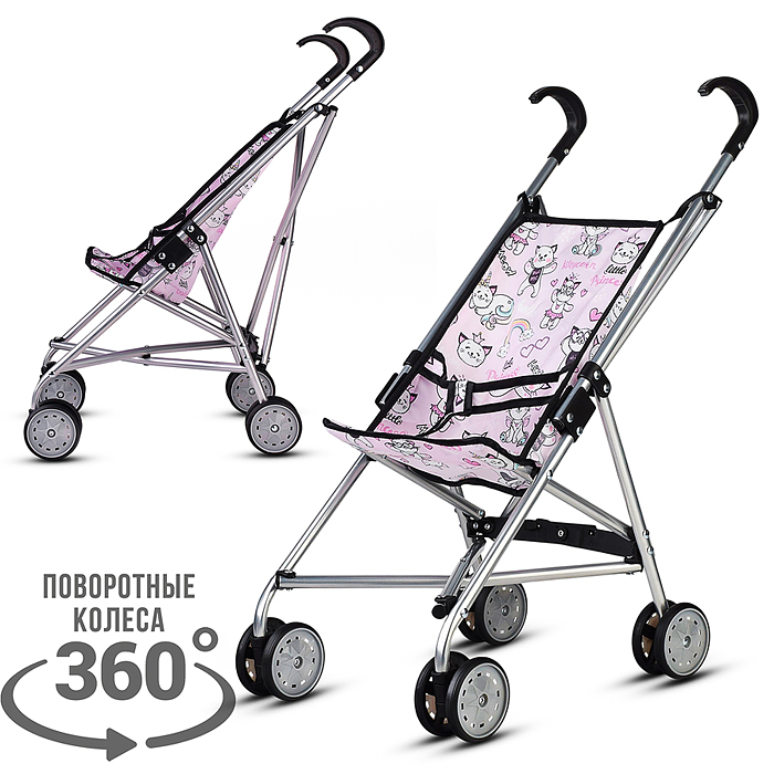 Коляская кукольная трость, металлическая, принт кошки 9302W