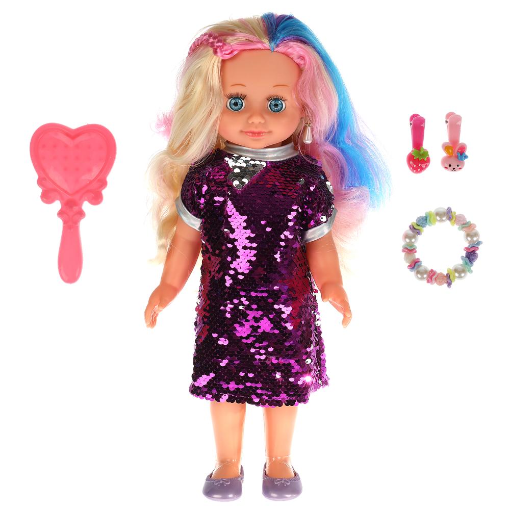 Развивающая интерактивная кукла «Аннушка» ТМ «Карапуз» станет прекрасным подарком для вашей маленькой принцессы: - поёт 2 песни: «АБВГДейка», «Волшебный цветок» - рассказывает 3 стихотворения - знает 2 скороговорки - загадывает 2 загадки - говорит разные фразы - цветные пряди - вместе учим вежливые слова - учимся быть аккуратными - учимся помогать маме В комплекте: - расчёска - 2 заколки - резинка для волос Милая кукла с детально проработанным личиком обязательно понравится малышке. Аннушка одета в нарядное фиолетовое платье из блестящих пайеток. Одежда легко снимается и надевается. У куклы длинные красивые разноцветные волосы, которые хозяйка куклы сможет укладывать в разнообразные причёски, для этого в наборе имеется расческа, резиночки и заколки. Игра с интерактивными куклами ТМ «Карапуз» учит ребёнка заботиться об окружающих, быть ответственным и внимательным, а также развивает: - воображение - память - звуковое восприятие и музыкальный слух - социально-коммуникативные навыки Рост куклы: 40 см.