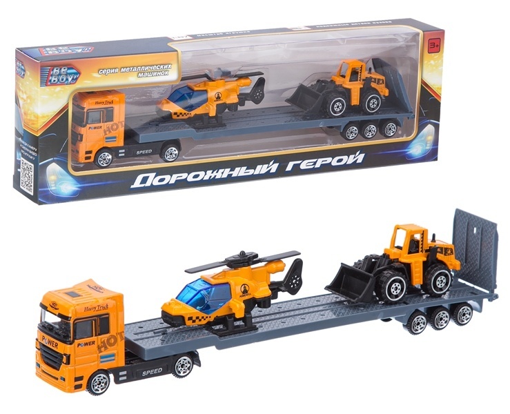 Мощный тягач с большой платформой перевозит автомобили. Коллекция представлена военной, строительной техникой, техникой экстренных служб и спорткарами - по 2 машинки с тягачом. У тягача откидывается задняя панель, превращаясь в удобный пандус, по которому могут заезжать и съезжать автомобили.