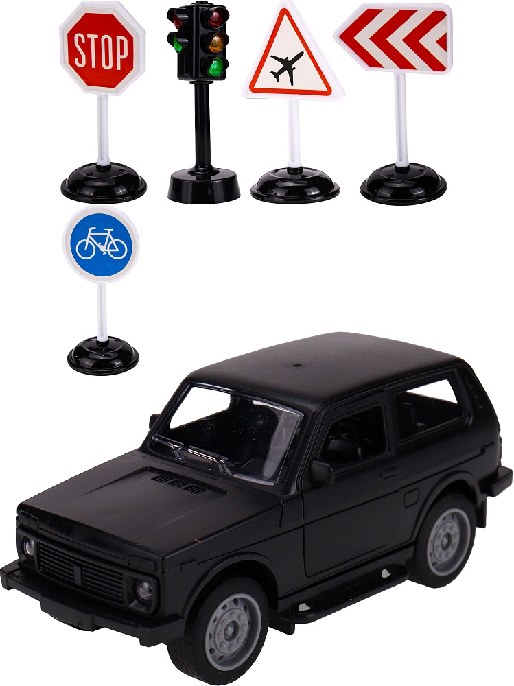 С набором машинок ребёнок сможет устроить настоящие гонки дома, в гостях или детском саду. Небольшой размер моделей машинок идеально подходит для маленькой детской ручки и позволяет использовать их совместно с игрушечными парковками, трассами и автотреками. Игры с машинками развивают мелкую моторику и воображение ребенка, с ними ваш малыш сможет придумать множество веселых и захватывающих игр. Материал: пластик. В наборе: 5 предметов (светофор, дорожные знаки).Светофор свет/звук работает от батареек 3*AG3 (в комплекте). Двери у машинки открываются. Цвет машинки: чёрный. В пакете с хедером.