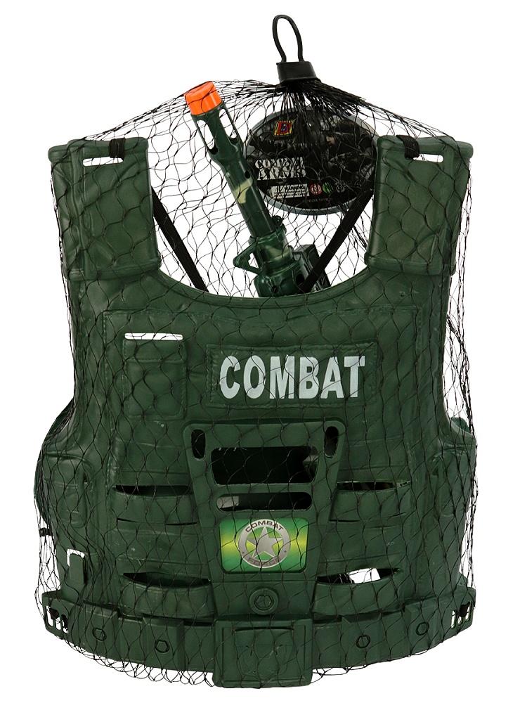Военные наборы — игрушки для детей, которые популярны среди мальчиков разных возрастов. Благодаря такому набору все ребятишки смогут весело проводить время, отражать атаки, организовывать оборону игрушечного города, придумывать разные истории и устраивать боевые действия. Материал: пластик, текстиль. В наборе: 10 предметов:жилет, каска, граната, часы, автомат,наручники, рация, бинокль, фляга. Жилет размер 28*33 (застегивается на защелку сзади на резинках.) В пакете.