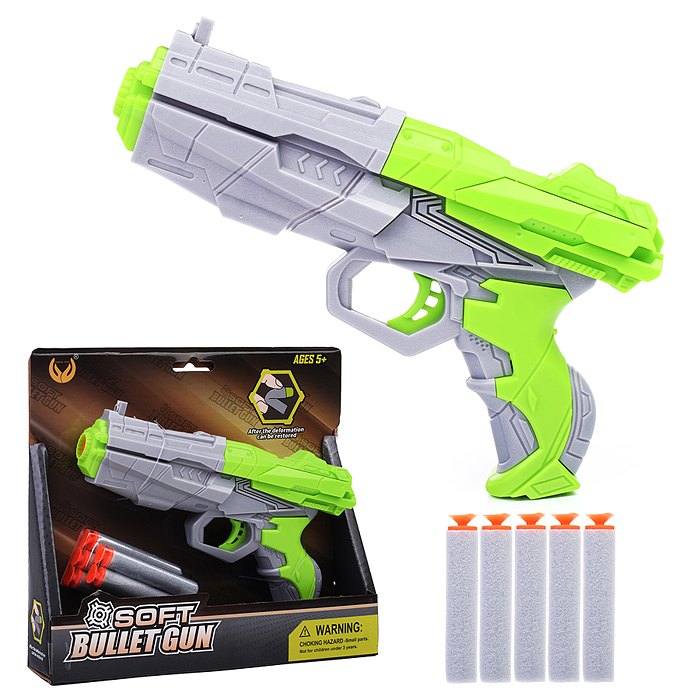 В комплекте пять патронов. Размеры пистолета: 18 х 11 х 4 см. Материалы: пластик, полимерные материалы. Соответствует требованиям безопасности продукции. Для детей от 5 лет.