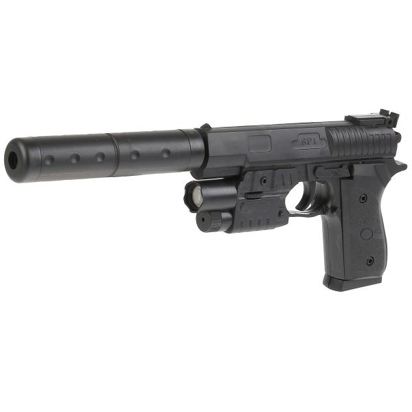 Пистолет с лазерным прицелом, выполненный в виде современного оружия, приведёт юного стрелка в восторг! Функции и комплектация: - лазерный прицел - световые эффекты (фонарик) - съёмный глушитель Игрушечное оружие развивает много полезных качеств у ребёнка, при этом не вредит окружающим и учит во время игры защищать себя и своих близких. С функциональным пистолетом маленький герой будет придумывать увлекательные спецзадания, защищать мир и стоять на страже порядка. С таким оружием ребёнок будет самым метким стрелком. Подойдёт для активных игр на воздухе и в помещении. Игрушка способствует развитию: - фантазии и воображения - ловкости и сноровки Материал пластмасса. Рекомендовано детям от 3 лет.