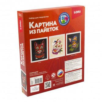 Комплектация: Разноцветные пайетки, основа рзмером 20*25 см, рамка, цветная схема,пин-гвоздики, инструкция.