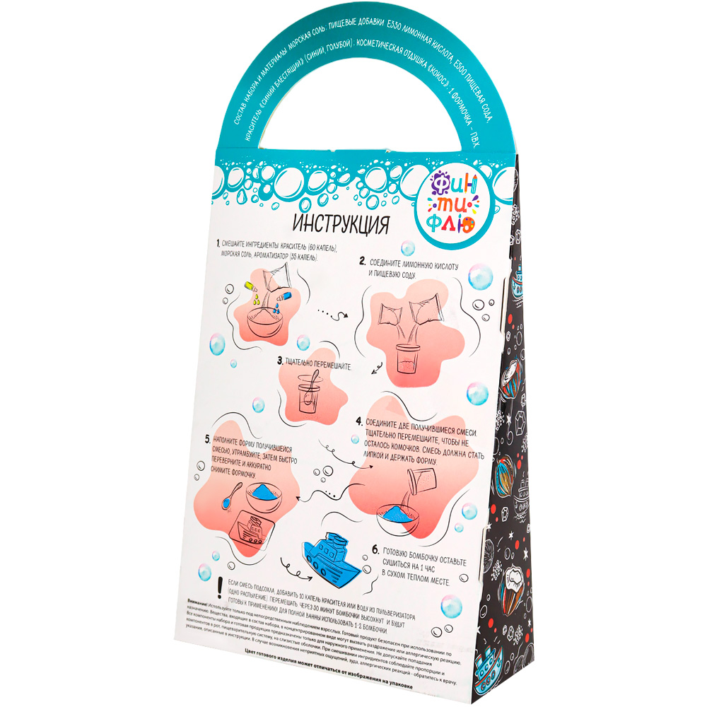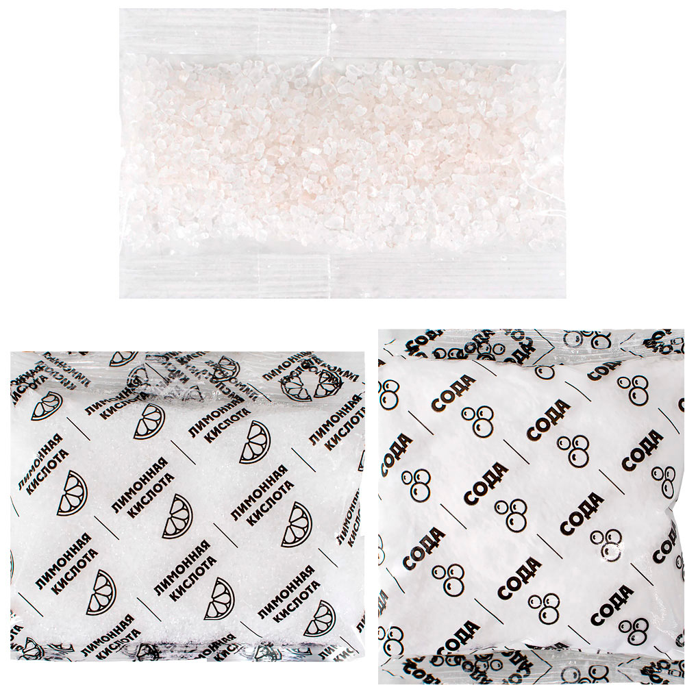 Комплектация: сода пищевая - 1 уп., лимонная кислота - 1 уп., морская соль - 1 уп., ароматизатор - 1 уп., пищевой краситель - 1 уп., формочка - 1 шт.